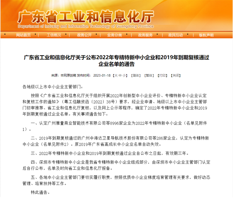 近日,广东省工业和信息化厅关于公布2022年专精特新中小企业和2019年到期复核通过企业名单的通告,官方网站凭借在物联网行业的雄厚实力和行业影响力突出表现,在众多申报企业中脱颖而出,荣获“2022年广东省专精特新中小企业”荣誉称号。